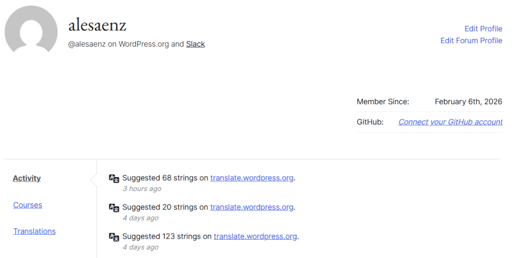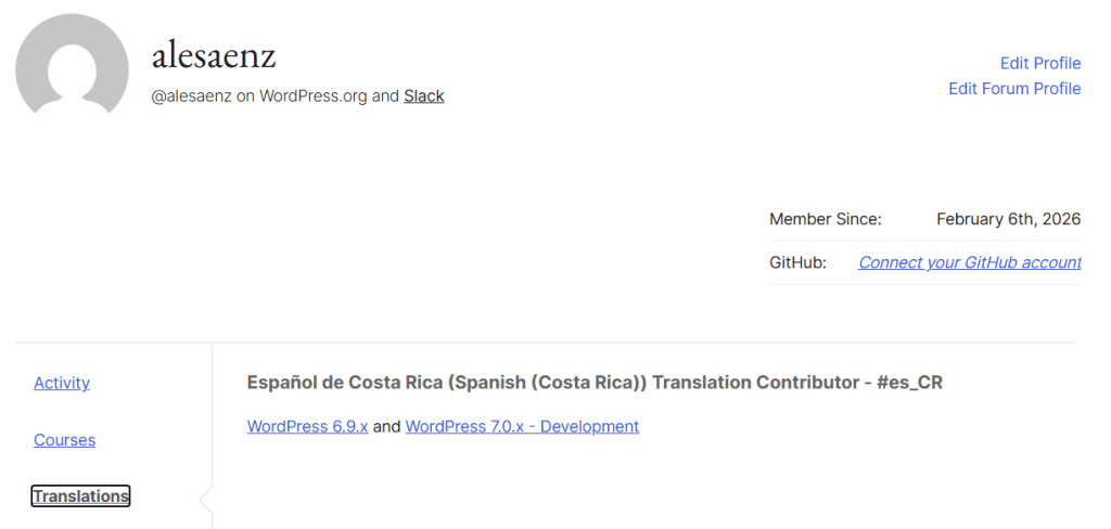Después de días de que empece a traducir strings, me sentí contento con mi trabajo, sentí que traducir mas de 100 strings iba a ser algo frustrante, pero el flujo de trabajo es realmente sencillo, y aunque quisiera poder mostrar mi aporte, ninguna de mis traducciones han sido revisadas o aceptadas aun, pero ya en mi cuenta de WordPress aparezco como un contribuyente de traducción para el español de Costa Rica, lo que me mantiene motivado.